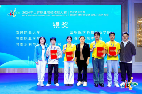 2024年10月25日—27日,2024年世界职业院校技能大赛总决赛争夺赛高职组财经商贸赛道“电子商务”赛项在广东科学技术职业学院举行,来自全国32个省、自治区、直辖市的63支队伍共252名选手参加比赛。经过两天的激烈角逐,我校经济管理系教师方艺璇、信息工程系教师沙昉奕指导的,由经济管理系学生宋乃道、陈庆琪、李高飞、耿宇航组成的竞赛团队,凭借出色的综合职业素养和过硬的专业操作技能斩获大赛银奖。这是我校首次在国赛财经商贸赛道中获得奖项,首赛即获银奖,取得了重要突破。