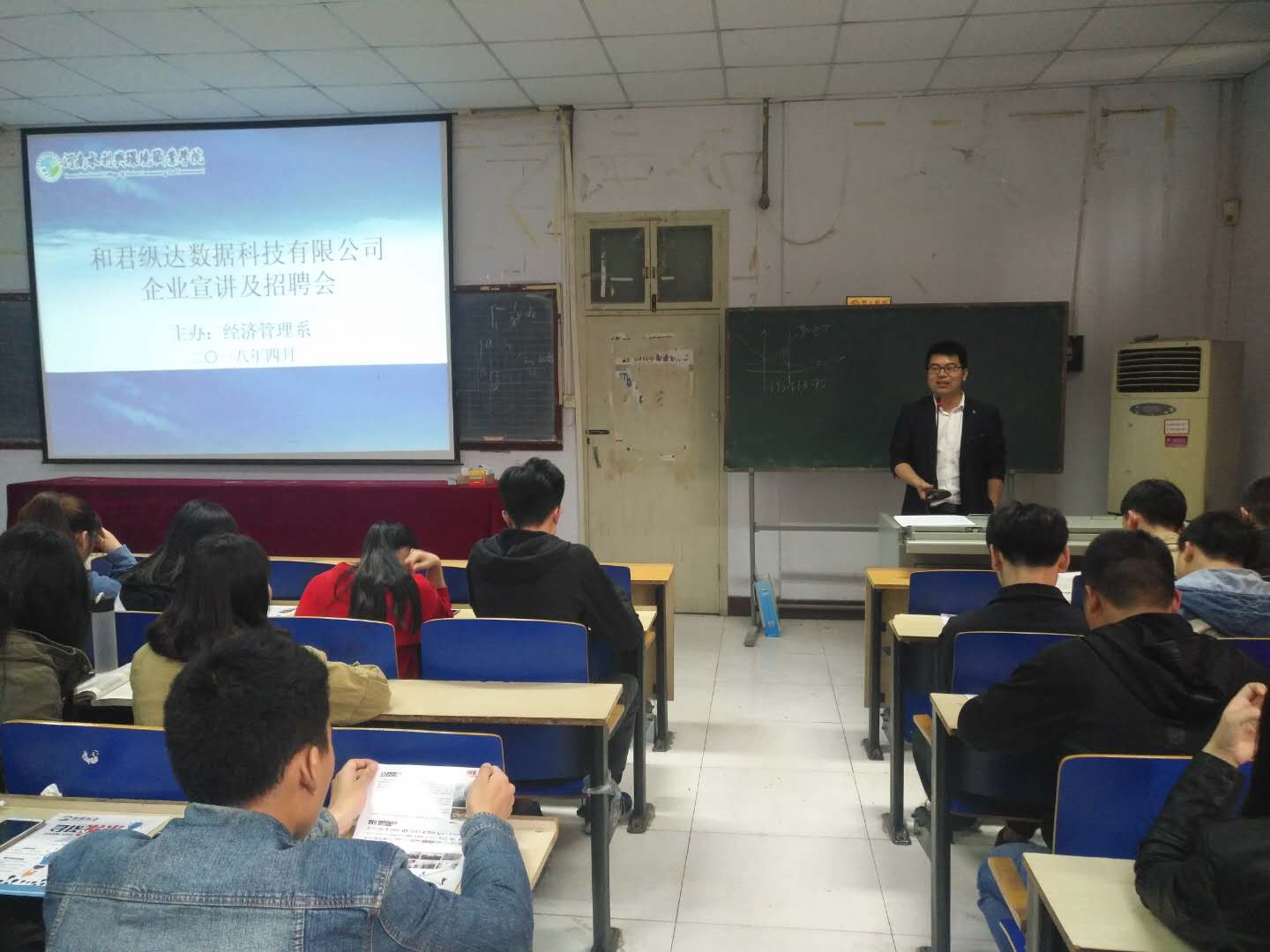 为有效开展2016级学生顶岗实习和毕业服务工作,帮助学生提前找到实习单位和就业单位。4月24日下午,我们邀请到和君纵达数据科技有限公司在北教讲堂1举办了专场招聘会。2016级经济管理系各专业学生参加了此次招聘会。