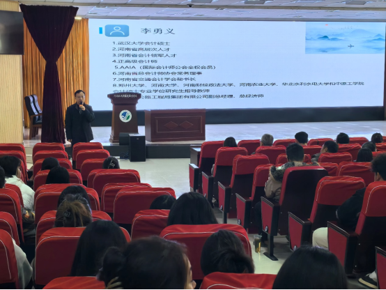 讲座上,李勇义以“数字经济背景下管理会计人才需求探析”为题,介绍了河南省公路工程局集团有限公司的起源、建设和发展历程,通过翔实的案例讲解了管理会计在工程局集团的具体应用,结合集团对在职会计人员的人才培养思路和方法为同学们规划了未来职业发展路径,鼓励同学们努力学习专业知识、考取相关职业证书、深入工作第一线掌握业务流程和特点,努力实现自己的职业目标,成就人生理想。