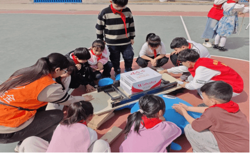 在开展校内活动的同时,学院志愿者团队同步前往郑州航空港区思寸路小学,为小学生打造了一场趣味十足的“平安训练营”。考虑到小学生的认知特点,志愿者们摒弃传统说教模式,创新采用“动画演示+互动游戏”的形式,让急救知识变得生动易懂。同时结合校园常见安全问题,带领孩子们练习基础急救动作,使用教学设备模拟应急救援场景,让孩子们在实践体验中掌握基本安全技能。
